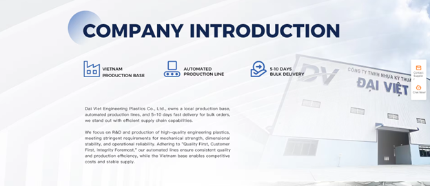 Thành lập năm 2025, Công ty TNHH Nhựa Kỹ thuật Đại Việt là nhà sản xuất chuyên nghiệp hàng đầu trong lĩnh vực vật liệu nhựa kỹ thuật tại Việt Nam. Chúng tôi cung cấp các giải pháp vật liệu tối ưu, phục vụ đa dạng các ngành công nghiệp trong nước và quốc tế. Với nền tảng sản xuất vững chắc và công nghệ hiện đại, Đại Việt tự tin mang đến những sản phẩm ổn định, hiệu quả và có sức cạnh tranh cao trên thị trường toàn cầu.